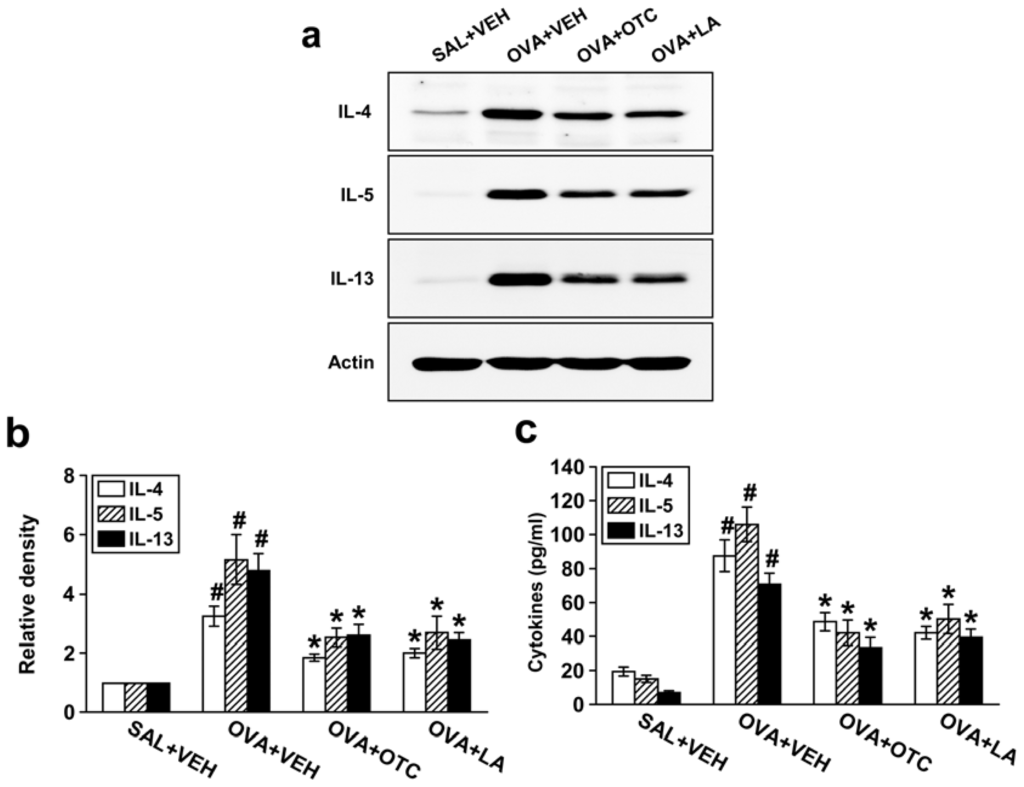 Allergic airway inflammation is largely a Th2-driven phenomenon and Th2 cytokines may contribute to structural changes of airway remodeling [18]. We thus tested the effect of OTC or LA on Th2 cytokine expression. Western blot analysis revealed that protein levels of IL-4, IL-5, and IL-13 in lung tissues were substantially higher in OVA-inhaled mice than in the control mice (Figure 6a,b). We observed significant decreases in these cytokine levels in lung tissues by administration of OTC or LA. In agreement with these observations, enzyme immunoassay also showed that levels of IL-4, IL-5, and IL-13 in BAL fluids were profoundly increased after OVA inhalation and that OTC or LA dramatically reduced these increases in Th2 cytokine levels of BAL fluids (Figure 6c).