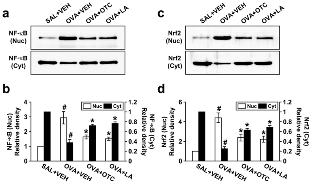 Effect of OTC or LA on levels of NF-κB p65 and Nrf2 in lung tissues. Sampling was performed at 48 h after the last challenge in saline-inhaled mice administered drug vehicle (SAL + VEH), OVA-inhaled mice administered drug vehicle (OVA + VEH), OVA-inhaled mice administered OTC (OVA + OTC), and OVA-inhaled mice administered LA (OVA + LA). (a) Representative Western blot analyses of NF-κB p65 levels in nuclear (Nuc) and cytosolic (Cyt) protein extracts from lung tissues; (b) Densitometric analyses are presented as the relative ratio of NF-κB p65 levels in OVA + VEH, OVA + OTC, or OVA + LA to those in SAL + VEH; (c) Western blot analyses of Nrf2 levels in nuclear and cytosolic protein extracts from lung tissues; (d) Densitometric analyses are presented as the relative ratio of Nrf2 levels in OVA + VEH, OVA + OTC, or OVA + LA to those in SAL + VEH. The relative ratio of NF-κB (b) or Nrf2 (d) in nuclear protein extracts from the lung tissues of SAL + VEH is arbitrarily presented as 1. Data represent mean ± SEM from 9 mice per group. # p < 0.05 versus SAL + VEH; * p < 0.05 versus OVA + VEH.
