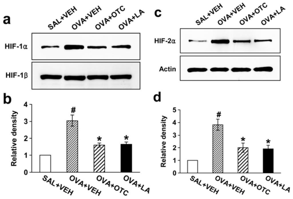 Effect of OTC or LA on levels of hypoxia-inducible factor (HIF)-1α, HIF-1β, and HIF-2α in nuclear protein extracts from lung tissues. Sampling was performed at 48 h after the last challenge in saline-inhaled mice administered drug vehicle (SAL + VEH), OVA-inhaled mice administered drug vehicle (OVA + VEH), OVA-inhaled mice administered OTC (OVA + OTC), and OVA-inhaled mice administered LA (OVA + LA). (a) Representative Western blotting of HIF-1α and HIF-1β; (b) Densitometric analyses are presented as the relative ratio of HIF-1α to HIF-1β. The relative ratio of HIF-1α in the lung tissues of SAL + VEH is arbitrarily presented as 1; (c) Representative Western blotting of HIF-2α; (d) Densitometric analyses are presented as the relative ratio of HIF-2α to actin. The relative ratio of HIF-2α in the lung tissues of SAL + VEH is arbitrarily presented as 1. Data represent mean ± SEM from 9 mice per group. # p < 0.05 versus SAL + VEH; * p < 0.05 versus OVA + VEH.
