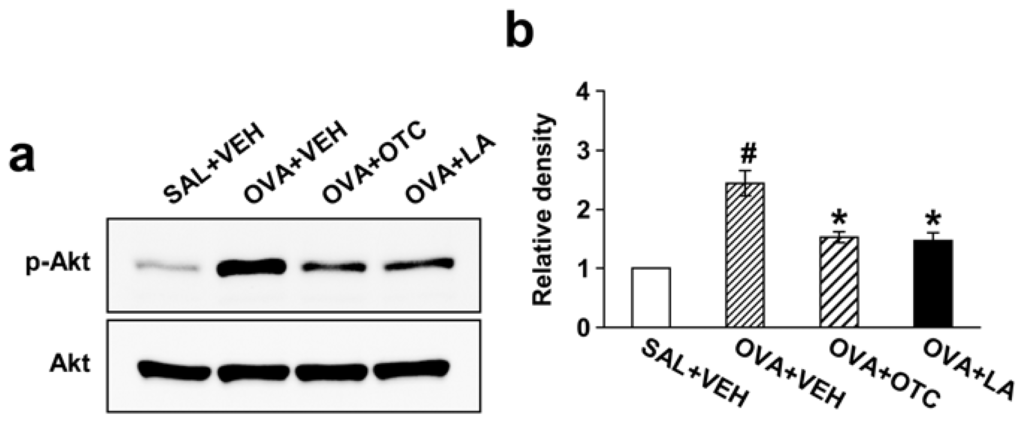 Effect of OTC or LA on p-Akt and Akt protein expression in lung tissues. (a) Western blotting of p-Akt and Akt in lung tissues. p-Akt and Akt protein expression was measured at 48 h after the last challenge in saline-inhaled mice administered drug vehicle (SAL + VEH), OVA-inhaled mice administered drug vehicle (OVA + VEH), OVA-inhaled mice administered OTC (OVA + OTC), and OVA-inhaled mice administered LA (OVA + LA); (b) Densitometric analyses are presented as the relative ratio of p-Akt to Akt. The relative ratio of p-Akt in the lung tissues of SAL + VEH is arbitrarily presented as 1. Data represent mean ± SEM from 9 mice per group. # p < 0.05 versus SAL + VEH; * p < 0.05 versus OVA + VEH.