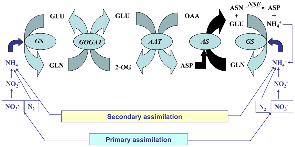 Other enzymes are in charge of the utilization of the glutamine synthesised by glutamine synthetase in order to achieve the synthesis of the rest of organonitrogen compounds required by plants. Glutamate synthase (GOGAT) is of crucial importance because it acts in tandem with GS for the synthesis of glutamate by means of the GS-GOGAT cycle. Two different types of GOGAT enzymes exist in plants called respectively Fd-GOGAT (EC 1.4.7.1) or NADH-GOGAT (EC 1.4.1.14), depending on the use of either ferredoxin or NADH as electron donors [31,32]. Of crucial importance too is asparagine synthetase (AS, EC 6.3.5.4), which acts in conjunction with GS, GOGAT and aspartate aminotransferase (AAT, EC 2.6.1.1) for the synthesis of asparagine that can be used for N translocation in plants (Figure 2). In addition, we should also mention glutamate dehydrogenase (GDH, EC 1.4.1.2) as a complementary enzyme in charge of a reversible amination/deamination reaction which could lead to either the synthesis or the catabolism of glutamate. The role of GDH in glutamate metabolism in plants has been the subject of continued controversy. Except for particular stress conditions most reports indicate that GDH is mostly associated with the catabolic deamination of glutamate rather than a role in glutamate biosynthesis [32].