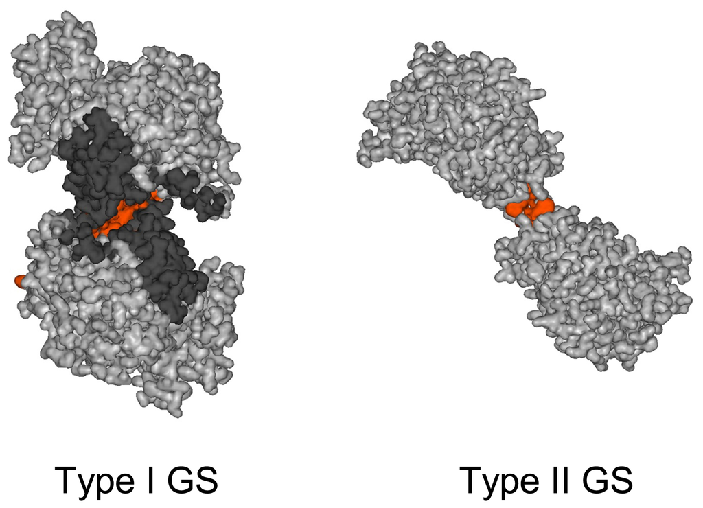 Differences in the amount of inter-ring subunit interactions of type I and type II GS. The figure shows in orange the main contact region among subunits existing in Salmonella typhimurium GS (type I GS) compared to GS1a from maize (type II GS) as drawn in a lateral view from their corresponding three dimensional structures.