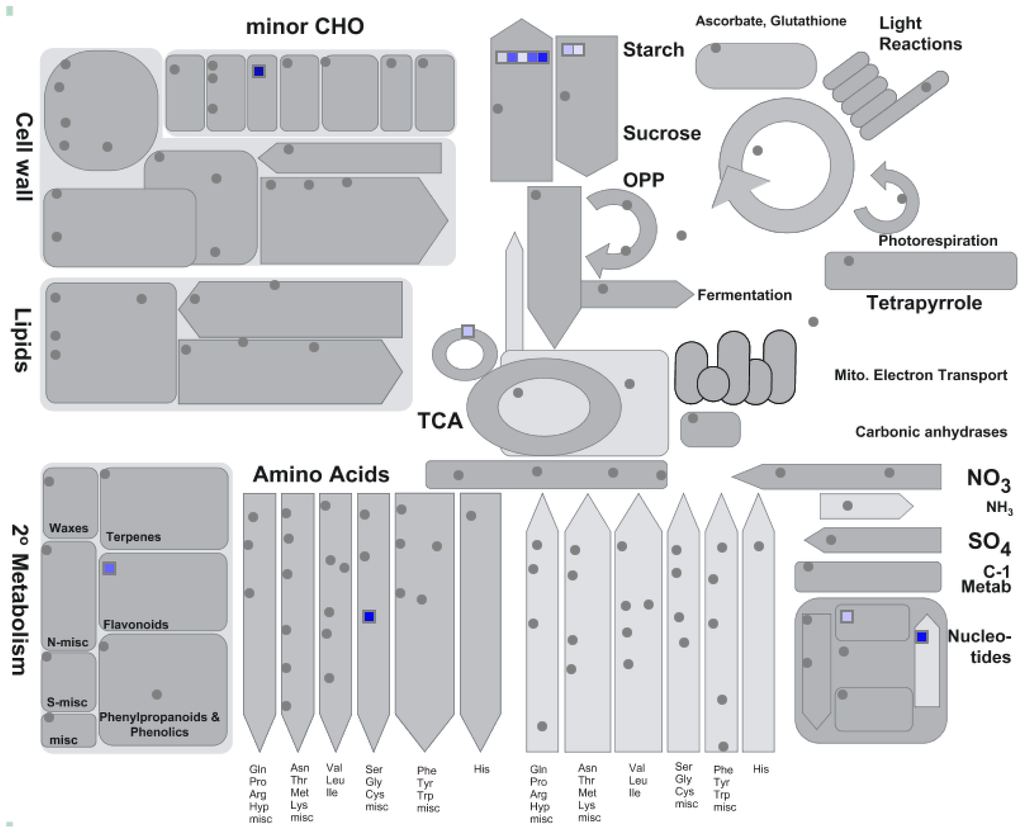 Co-expression analysis of plastidic GS. An overview of general metabolism was created using MapMan. Blue squares represent genes that are positively co-expressed (Pearson distance <0.3) with plastidic GS. The intensity of the blue color is proportional to the degree of correlation between a certain gene and the plastidic GS gene.