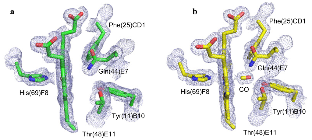 - Vojtechovsky, J.; Chu, K.; Berendzen, J.; Sweet, R.M.; Schlichting, I. Crystal structures of myoglobin-ligand complexes at near-atomic resolution. Biophys. J 1999, 77, 2153–2174. [Google Scholar]