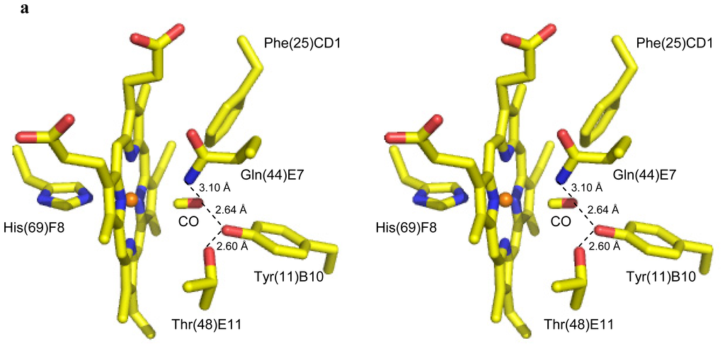 | Tyr(11)B10 OH---Gln(44)E7 NE2 (Å) | 3.13 | 3.06 | 3.24 |