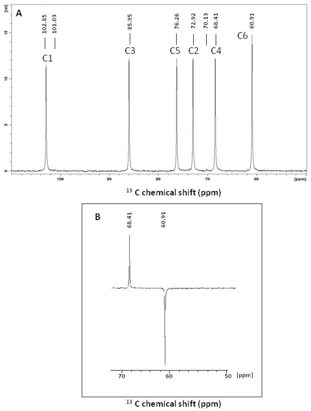 13C NMR spectrum of the water-insoluble glucan isolated from the baker’s yeast Saccharomyces cerevisiae. (A) The number of carbon atoms was labeled on each peak to indicate the position. (B) The inset shows a DEPT-135 analysis of the C-6 region.