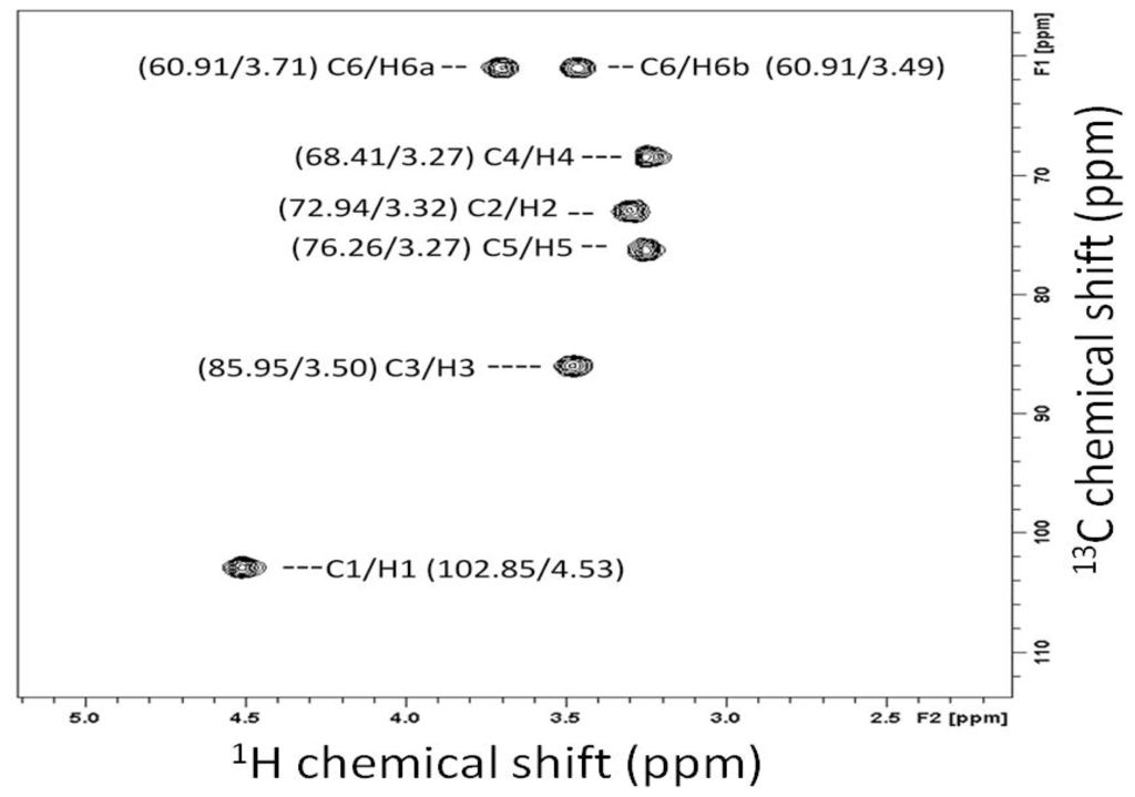 All of the protons were assigned to carbons using the two-dimensional (2D) 1H-13C NMR heteronuclear single quantum correlation (HSQC) spectrum (Table 1 and Figure 2). All of the NMR chemical shifts are comparable to literature values [19–23]. The results from the 1H-13C NMR spectrum confirmed that the water-insoluble compound is a (1→3)-β-linked glucan that is similar to laminarin, which is a standard (1→3)-β-glucan [24].
