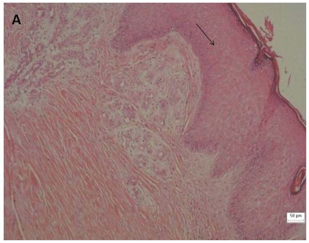 Epithelial hyperplasia was present at the ulcer edges in all of the specimens at day 0. Five specimens (38.5%) had reactive and reparative epithelial changes in the stratified squamous epithelium that were associated with hyperplasia. Keratinocyte reactivity was clearly demonstrated by the presence of anisokaryosis, anisonucleose and other changes. Inflammation was apparent in all of the specimens and inflammatory cells: lymphocytes (mean: 25.62 cells/field), plasmocytes (mean: 25.23 cells/field) and neutrophils (mean: 43.31 cells/field) were present.
