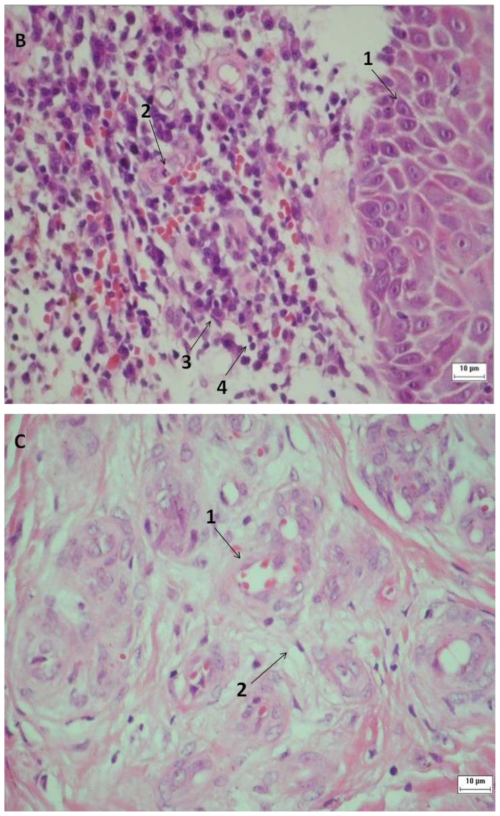 Histology of the venous ulcers. The tissue was stained with hematoxylin and eosin (H & E) to visualize the cellular morphology. Samples A, B and C were collected prior to (1→3)-β-glucan treatment. The following magnifications are shown: 100 × H & E stain for A; 400 × H & E stain for B and C. (A) The arrow indicates epithelial hyperplasia at the edge of the ulcer. (B) Arrow No. 1 shows reactive and reparative epithelial changes in the stratified squamous epithelium and the other arrows show inflammatory cell infiltration, including neutrophil (arrow No. 2), plasmocyte (arrow No. 3) and lymphocyte (arrow No. 4). (C) Arrow No. 1 indicates angiogenesis associated with edema and arrow No. 2 indicates fibroblast.