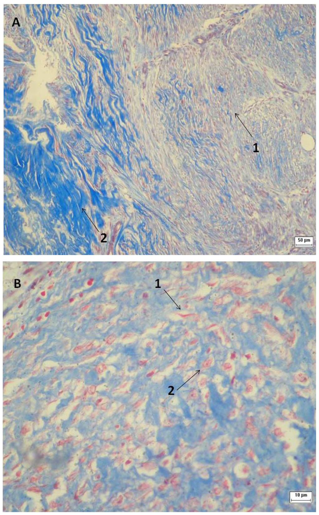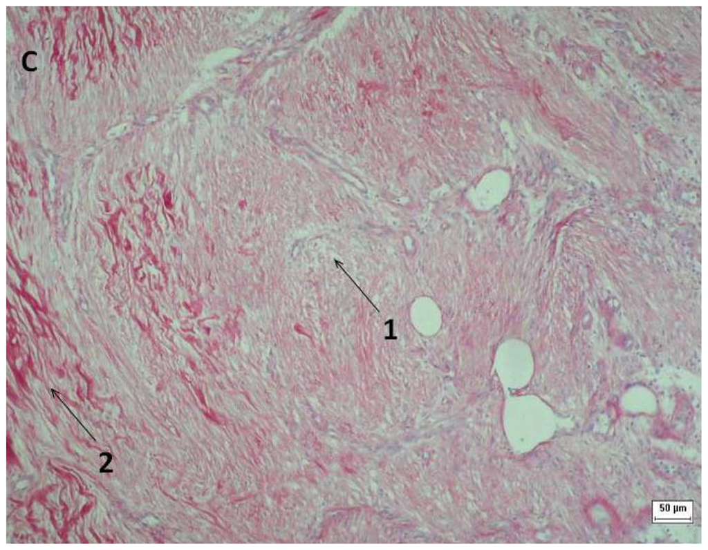 Venous ulcer histology. The tissues in samples A and B were stained with Masson’s trichrome, while sample C was stained with picrosirius red. Samples A, B and C were obtained prior to (1→3)-β-glucan treatment. The magnifications shown are as follows: 100 × for samples A and C; 400 × for sample B. (A and C) Arrow No. 1 indicates new collagen deposition in the ulcerated area and arrow No. 2 indicates senescent collagen deposition deep within then venous ulcer. (B) Arrow No. 1 indicates senescent fibroblast and arrow No. 2 indicates young fibroblast amid collagen deposition in the ulcerated area.