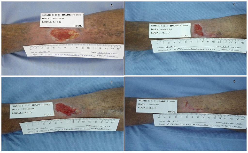 A nonrandomized clinical trial with intragroup comparisons over time was performed. The study was approved by the Research Ethics Committee of the University Hospital Onofre Lopes, HUOL/UFRN, Brazil (protocol number: 147/07). The study included male and female venous ulcer patients who were older than 18. The patients were admitted to the Vascular Surgery Ambulatory at the University Hospital Onofre Lopes, HUOL/UFRN. The exclusion criteria were the following: autoimmune disease, heart, renal or liver insufficiency and/or malignancies. Data regarding the ulcer location, duration, status (new or recurrent) and surface area were collected. The baseline patient medical history information included the following: diabetes mellitus, hypertension, endocrine disease, peripheral vascular disease, connective tissue disease, musculoskeletal disease and neurological disorders.