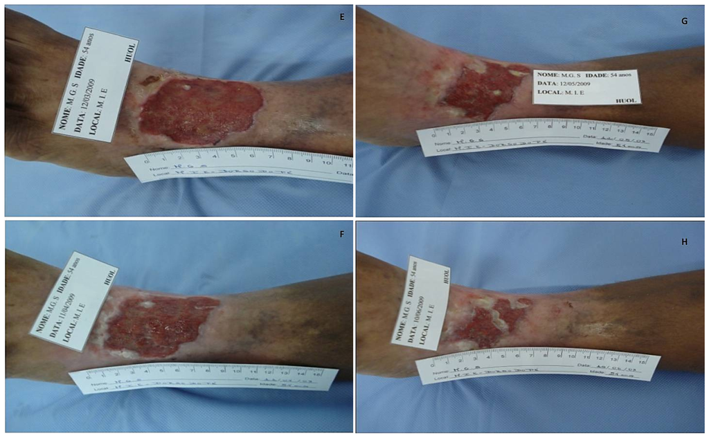 Initially, the venous ulcers possessed an average area of 27.51 cm2 (range of 8.38 to 66.89 cm2). Although these wounds were difficult to heal because of their duration, recurrence and area, the average of the reduction percentage on ulcer area was 11.3% after 30 days of glucan treatment. By day 90, one venous ulcer had healed completely, and 7 ulcers exhibited an average area of 16.48 cm2 (range of 2.08 to 41.42 cm2); the average of the reduction percentage on ulcer area was 55.23% at day 90. Figure 5A–D shows a venous ulcer on a right leg that healed completely after 90 days of glucan treatment. Interestingly, the ulcer shown in Figure 5E–H, which has not healed over the past 15 years, reduced in size by 67.8% after only 3 months of glucan treatment.