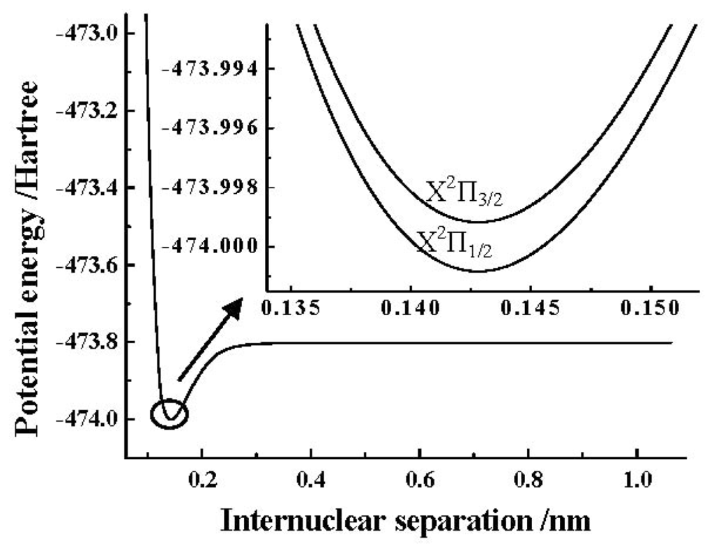 When the AVTZ basis set is used to perform the spin-orbit coupling calculations at the MRCI+Q level, the total energy of the X2Π1/2 component is −472.493589 Eh, and the total energy of the X2Π3/2 component is −472.492020 Eh at the internuclear equilibrium position. The former is lower than and the latter is higher than the corresponding one, −472.492804 Eh, of the X2Π electronic state. With the spin-orbit coupling correction added in the present MRCI+Q/AV5Z calculations, the energy separation of the two splitting components (X2Π1/2 and X2Π3/2) is 344.36 cm−1. According to the potential energies given here, it is not difficult to determine that the ground-state energy is lowered by about 172.29 cm−1 due to the spin-orbit coupling effect. As shown in Table 3, the spin-orbit coupling correction has no effect on the Re and only produces a very small effect on the ωe.