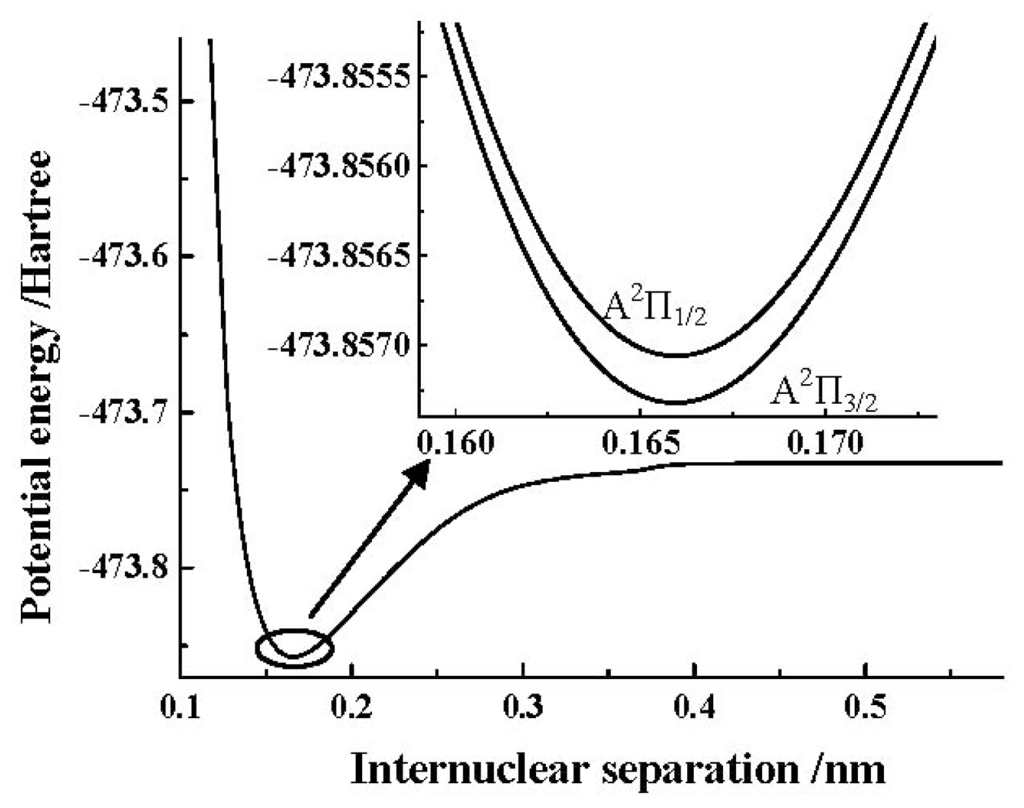 Table 5 also tabulates the spectroscopic results obtained by using the AVTZ basis set for the spin- orbit coupling calculations of the A2Π1/2 and A2Π3/2 components at the MRCI+Q/AV5Z+CV+DK level. As shown in Table 5, the inclusion of core-valence correlation and scalar relativistic corrections brings about no effect on the A0 for the SO+(A2Π3/2, 1/2), and still produces a very small effect on the Re and ωe.