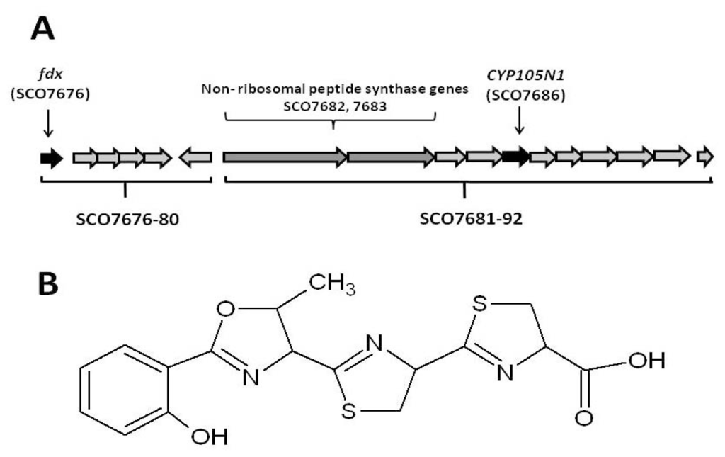(A) The secondary metabolite gene cluster which encodes for the biosynthesis of coelibactin in Streptomyces coelicolor A3(2). Genes SCO7676-80 encode a ferredoxin (SCO7676, colored black) and four putative metal transport proteins (SCO7677-80). Genes SCO7681-92 encode the coelibactin biosynthetic pathway including the non-ribosomal peptide synthase genes (SCO7682, 7683, colored grey) which synthesise the initial coelbactin molecule which is then enzymatically tailored by CYP105N1 (SCO7686, colored black) and possibly by proteins of unknown function (SC7684, 7685, 7688 and 7692). SCO7689 and SCO7690 encode putative ABC transporters. (B) The predicted structure of coelibactin as determined by analysis of the sequence of the nonribosomal peptide synthetase (NRPS) proteins and prior to enzymatic tailoring.