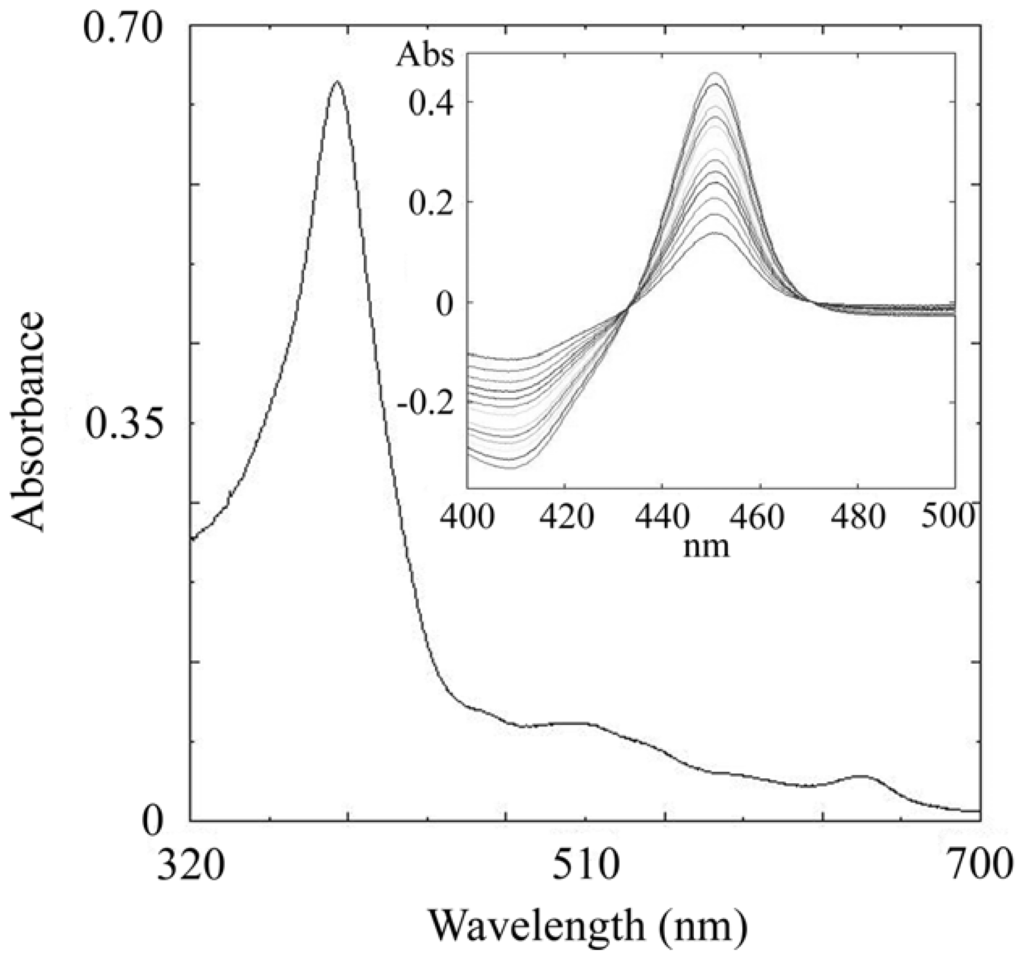 Absolute and carbon monoxide difference spectra of CYP105N1. Absorption spectrum of CYP105N1 (1 μM) in the oxidized (ferric) state and (inset) the reduced carbon monoxide difference spectrum of CYP105N1 (1 μM) showing a Soret maximum at 450 nm.