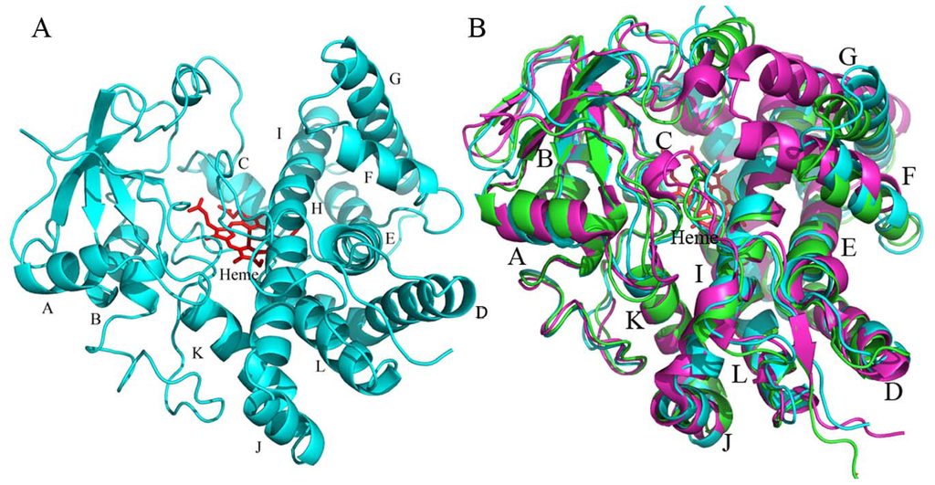 Ribbon diagram of CYP105N1. (A) The X-ray crystal structures show a typical cytochrome P450 fold. The ligand-free structure is represented in cyan, heme is shown as a red stick model; (B) Overlaid ribbon diagrams of CYP105N1 (cyan), CYP105AB3 ligand-free (green) and CYP105A1 imidazole-bound (magenta) structures.