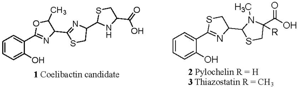 The predicted structure for coelibactin as determined by the analysis of the NRPS proteins prior to enzymatic tailoring is given in Figure 1B. Based on analysis of known siderophore structures this molecule is not predicted to possess a high affinity for iron(III) []. Furthermore it will not satisfy the coordination requirements of zinc(II). Thus enzymatic modification of this structure must occur in order for it to bind zinc with high affinity. Hydroxylation of the aromatic nucleus or any of the three heterocyclic rings will not create a zinc binding site in the molecule. However reduction of the terminal ring of the structure in Figure 1B generates a coelibactin candidate (1, Figure 4) which will bind zinc under physiological conditions in a tridentate mode, utilizing the terminal imino acid and the nitrogen of the adjacent heterocyclic ring. Without reduction, the tridentate coordination is not possible. Significantly, two analogous siderophores exist, each with the terminal heterocyclic ring being reduced, pyochelin (2) [] and thiazostatin (3) []. Whereas pyochelin chelates both iron(III) and zinc, coelibactin cannot bind iron(III) tightly, as the carboxylate function is too far separated from the phenol group. Thus, coelibactin is predicted to be selective for zinc.