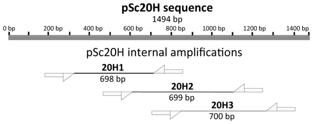 Dimensions (bp) of fragments expected from the amplification of three internal segments of pSc20H (accession number AF305943): 20H1, 20H2, and 20H3.