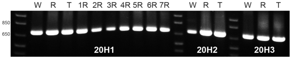 Differences between wheat-rye addition lines for amplification products using OPH20 10-mer primer were detected based on the presence or absence of pSc20H band. Thus, we further delineated a deeper analysis of such sequences using three pairs of primers designed to amplify pSc20H internal segments, namely 20H1 (698 bp); 20H2 (699 bp); and 20H3 (700 bp) (Figure 2).