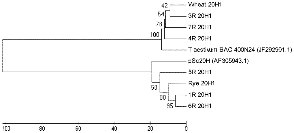 The 20H1 sequence amplified from rye (20H1Rye, accession number JX120158) shares 94% sequence similarity with the expected segment of pSc20H (pSc20H_20H1) and 20H1 sequences amplified from wheat addition lines of 1R, 5R and 6R rye chromosomes share 97% (20H1 1R, accession number JX120160), 95% (20H1 5R, accession number JX120163) and 96% 20H1 6R, accession number JX120164) homology with rye 20H1 sequence, respectively. 20H1 sequences amplified from the three wheat-rye addition lines referred to above share a level of sequence similarity between 96% and 98% with each other.
