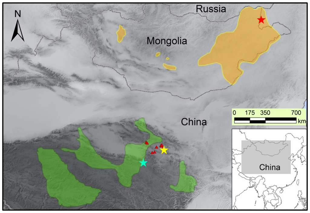 The green area represents the distribution range of P. picticaudata and the orange area represents the distribution of P. gutturosa. The red triangles represent the scattered distributed patches of P. przewalskii. The blue, red and yellow pentagrams indicate sampling locations of P. picticaudata, P. gutturosa and P. przewalskii, respectively. The shaded rectangle on the inset indicates the location of the main map in China.