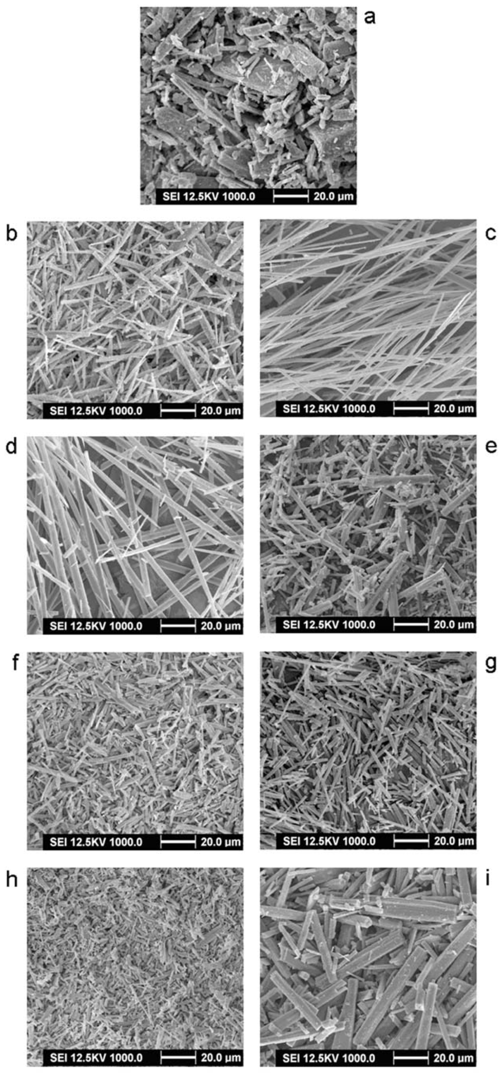 (a) Supercritical antisolvent (SEM) image of unprocessed taxifolin; (b), (c), (d), (e), (f), (g), (h) and (i) SEM images of processed taxifolin from Trial no.1, 4, 5, 7, 8, 10, 11 and 13 (in Table 1).