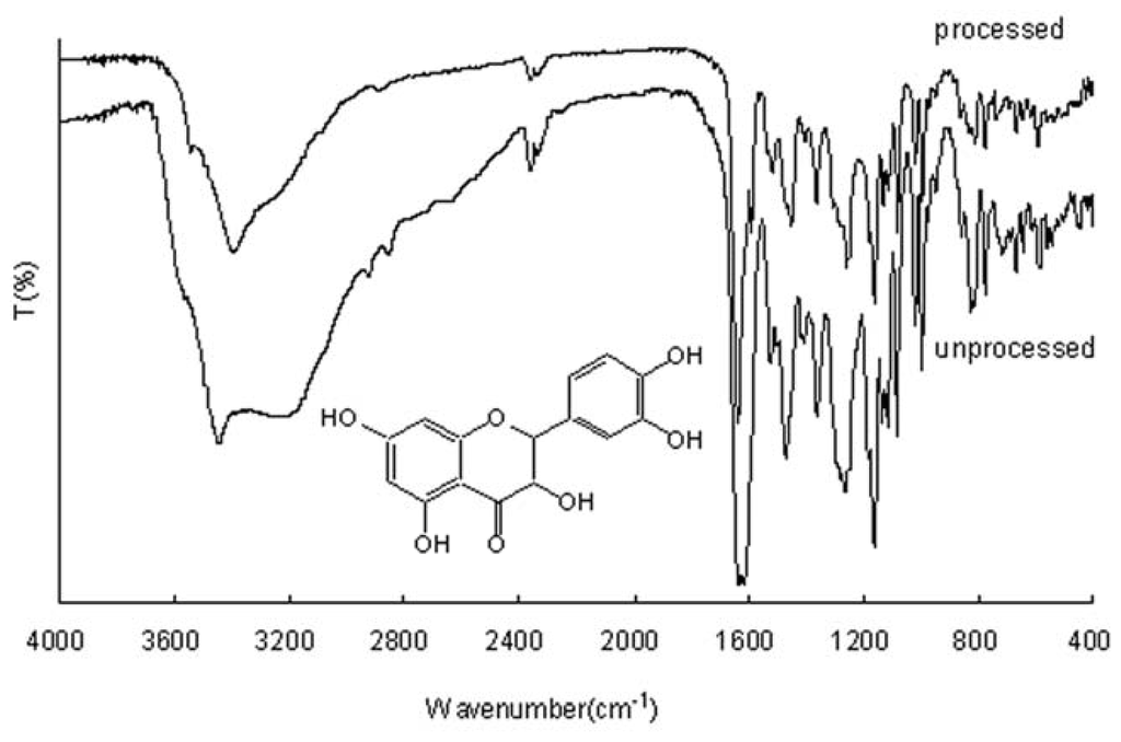 Fourier-transform infrared spectroscopy (FTIR) spectra of unprocessed and processed taxifolin (processed taxifolin is the micronized taxifolin precipitated from ethanol under optimum condition), trial no. 11 in Table 1. Insert: Chemical structure of taxifolin.