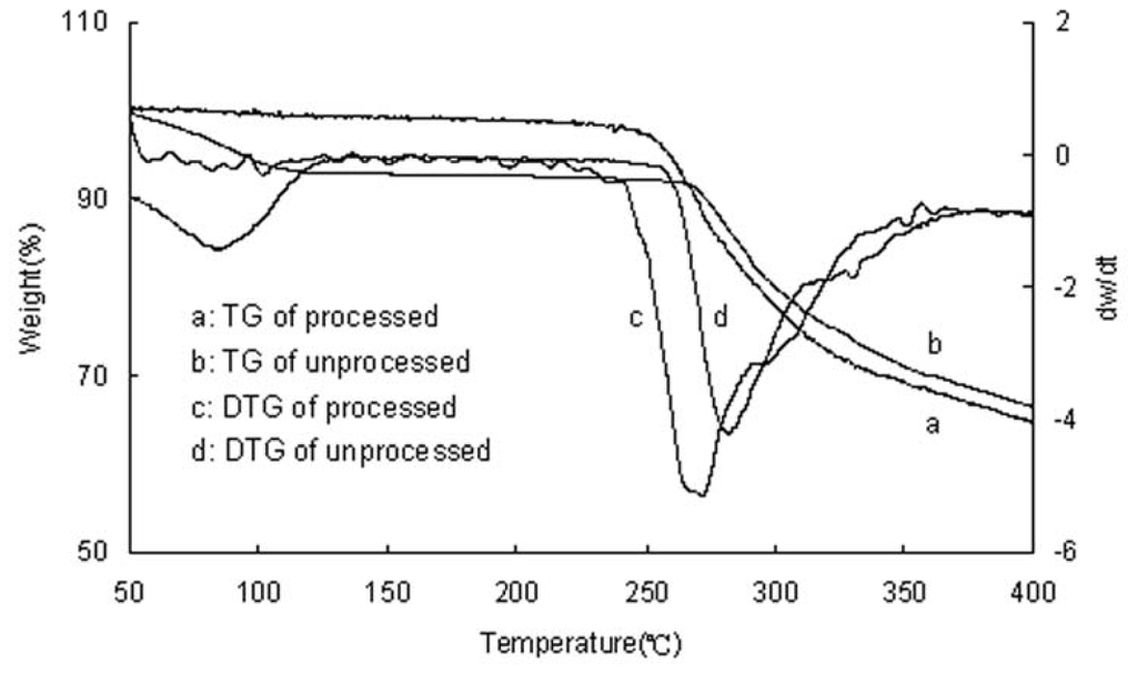 Thermal gravimetric/TG/DTG patterns of unprocessed and processed taxifolin (processed taxifolin is the micronized taxifolin precipitated from ethanol under optimum condition, trial no. 11 in Table 1).