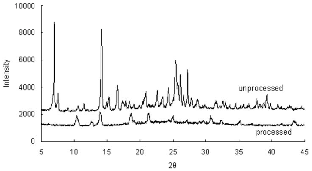 X-ray diffraction (XRD) patterns of unprocessed and processed taxifolin (processed taxifolin is the micronized taxifolin precipitated from ethanol under optimum condition, trial no. 11 in Table 1).