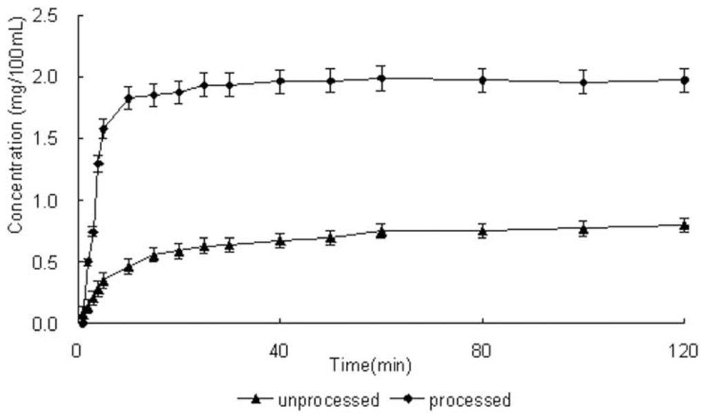Dissolution profiles of unprocessed and processed taxifolin (processed taxifolin is the micronized taxifolin precipitated from ethanol under optimum condition, trial no. 11 in Table 1).