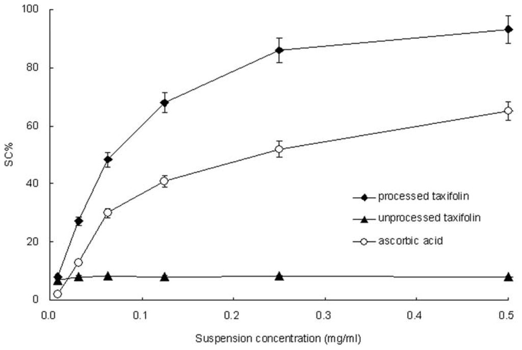 To determine the free radical scavenging activity of each sample, the DPPH· free radical scavenging assay reported by Lu [31] was used with minor modification. The amount of 0.8, 3.125, 6.25, 12.5, 25 and 50 mg processed or unprocessed taxifolin was added to 100 mL deionized water and ultrasonically treated for 10 min to get the processed or unprocessed taxifolin suspension, respectively. The suspensions were taken through the 0.45 μm membrane. Then 0.1 mL of each sample at different suspension concentrations (0.008–0.5 mg/mL) was added to 3.9 mL of ethanol DPPH solution (25 mg/L). The absorbance was measured at 517 nm after reaction for 30 min at 20 °C in the dark. Measurements were performed at least in triplicate. The DPPH scavenging capacity (SC) of the tested samples was measured as a decrease in the absorbance and was calculated using the following equation:
