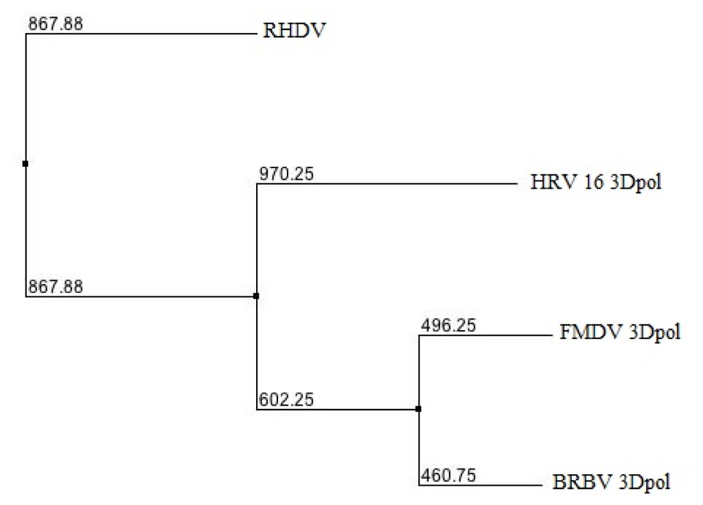 - Hollister, J.R.; Vagnozzi, A.; Knowles, N.J.; Rieder, E. Molecular and phylogenetic analyses of bovine rhinovirus type 2 shows it is closely related to foot-and-mouth disease virus. Virology 2008, 373, 411–425. [Google Scholar]