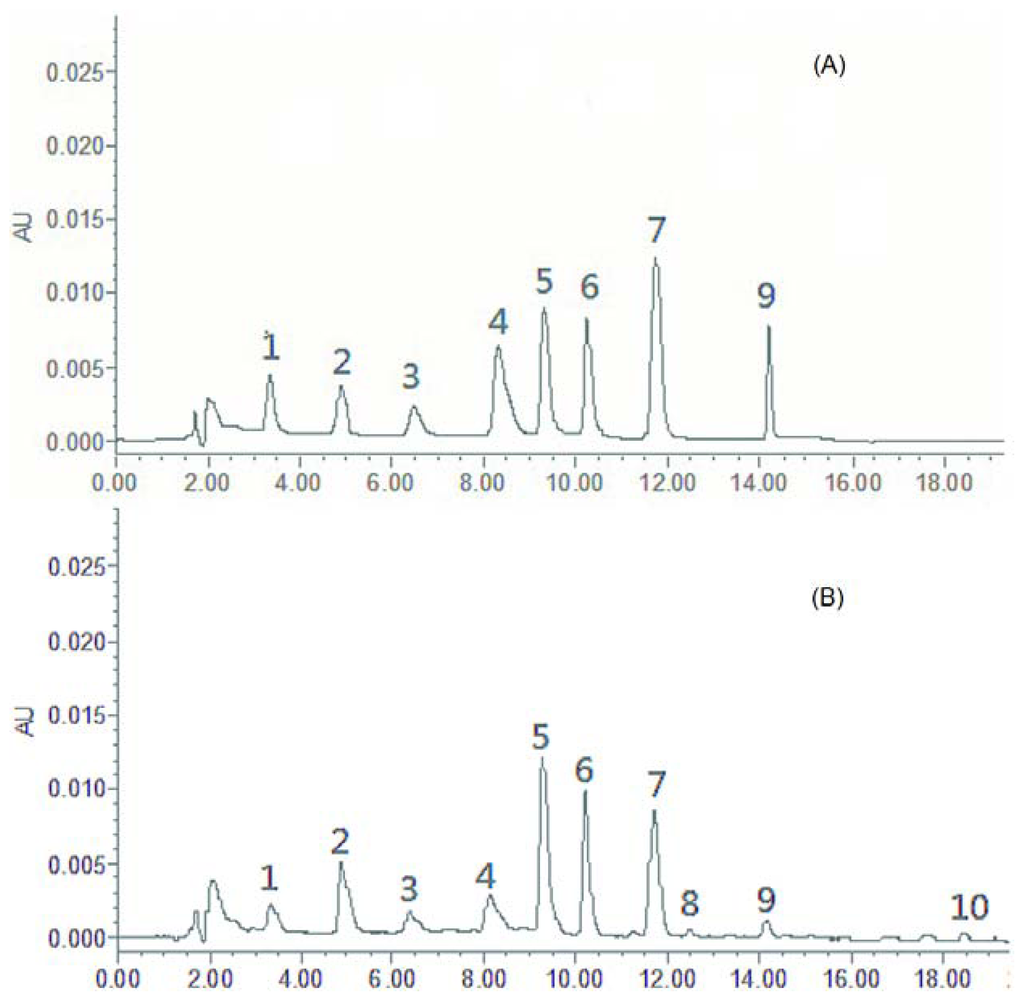 Based on the maximum absorption and full-scan experiment of the marker components in the UV spectra of the three-dimensional chromatograms obtained by PDA detection, the detection wavelengths at 210, 230, 254, 280 nm were selected to compare the peak number and peak resolution of all marker compounds. Finally, the wavelength was set at 254 nm (Figure 1).
