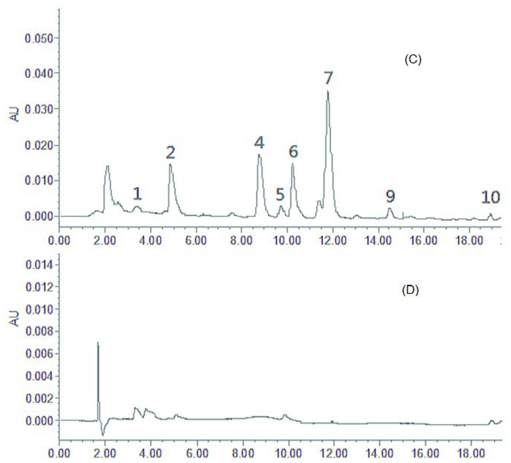 - Wang, Y.X.; Li, Q.; Wang, Q.; Li, Y.J.; Ling, J.H.; Liu, L.L.; Chen, X.H.; Bi, K.S. Simultaneous determination of seven bioactive components in Oolong Tea Camellia sinensis: Quality control by chemical composition and HPLC fingerprints. J. Agric. Food Chem 2012, 60, 256–260. [Google Scholar]