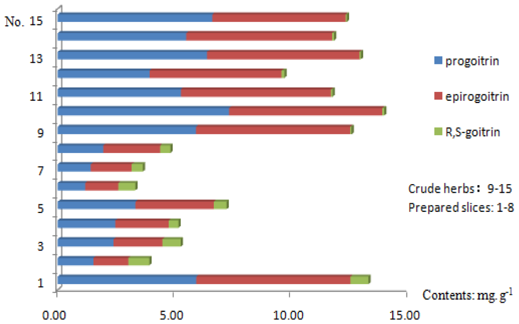 Glucosinolates are the characteristic constituents in the Cruciferae plants [28,29]. The results from the quantitative analysis (Table 3) showed that the crude herbs generally contained the eight selected constituents and the glucosinolate content ranged from 6.48 mg g−1 to 73.63 mg g−1. Table 3 and Figure 2 show that the average contents of epiprogoitrin, progoitrin, and R,S-goitrin in Radix Isatidis crude herbs are 5.86, 6.25, and 0.07 mg g−1. However, the average epiprogoitrin and progoitrin contents in prepared Radix Isatidis slices significantly decreased (2.53 and 2.68 mg g−1, respectively), whereas the R,S-goitrin content clearly increased (0.64 mg g−1). The traditional processing methods improve the glucosinolate biotransformation and increase the degradation product (R,S-goitrin) content [31].