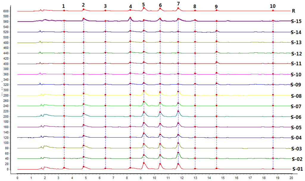 Data analysis was performed by the professional software of the Computer-Aided Similarity Evaluation System for Chromatographic Fingerprint of TCM (China Committee of Pharmacopeia, 2004A), which was recommended by the SFDA. The software was employed for synchronization and quantitative comparison between different samples [37].