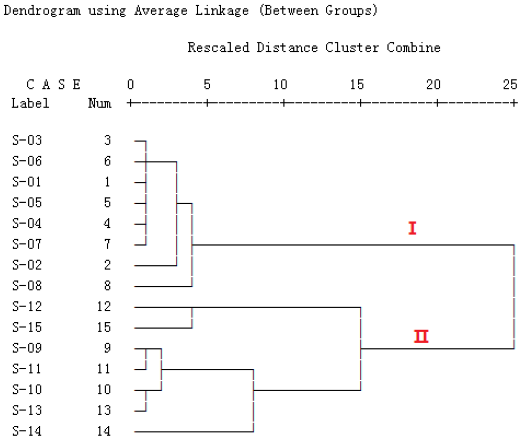Dendrogram of hierarchical clustering analysis (HCA) for the 15 tested samples. The hierarchical clustering was done by the SPSS software (version 15.0; IBM: Chicago, IL, USA, 2006). Ward’s method was performed, and Squared Euclidean distance was selected as a measurement.