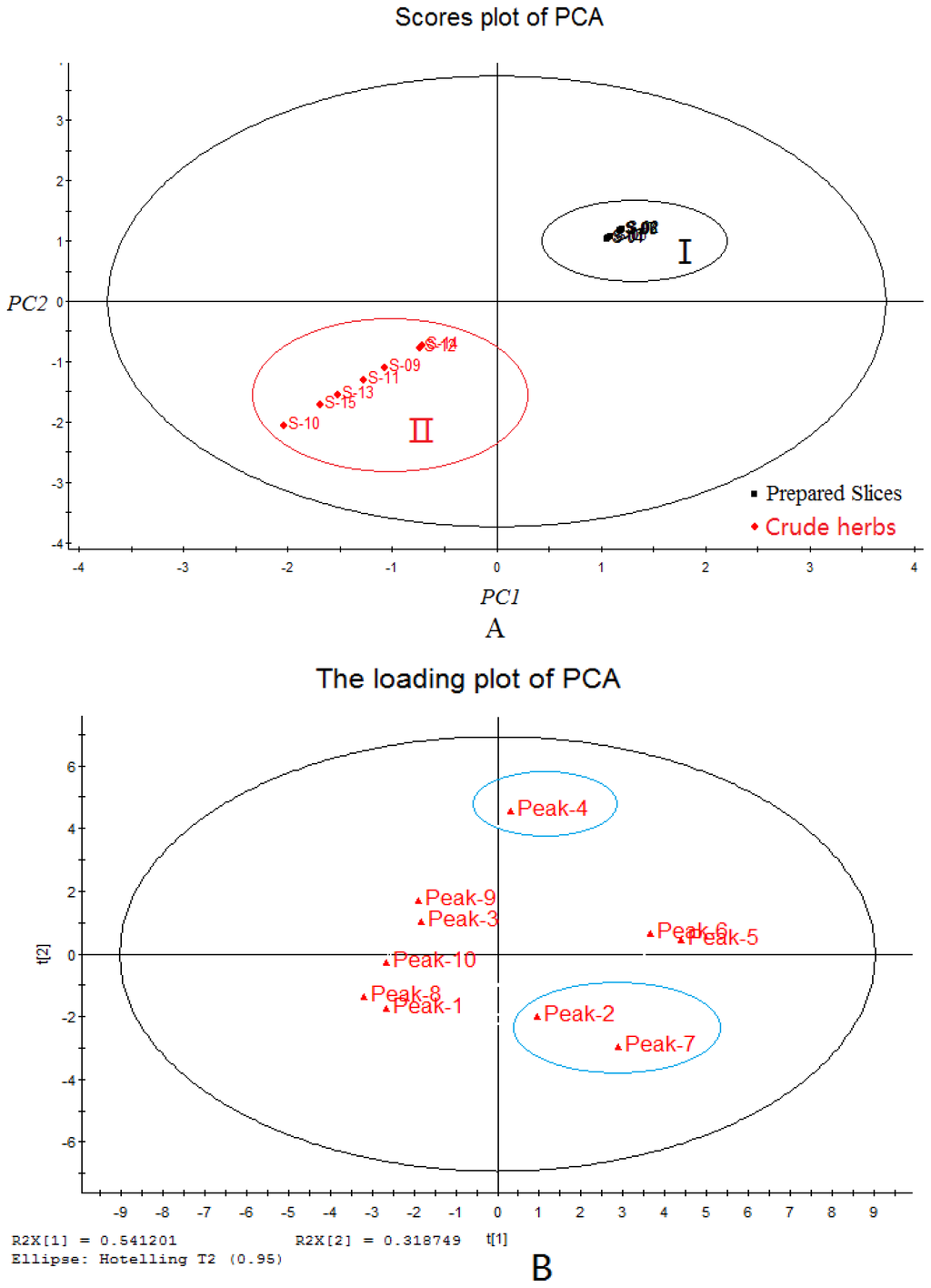 Score plot of principal component analysis (PCA) (A) and PCA loading plot (B) of Radix Isatidis.