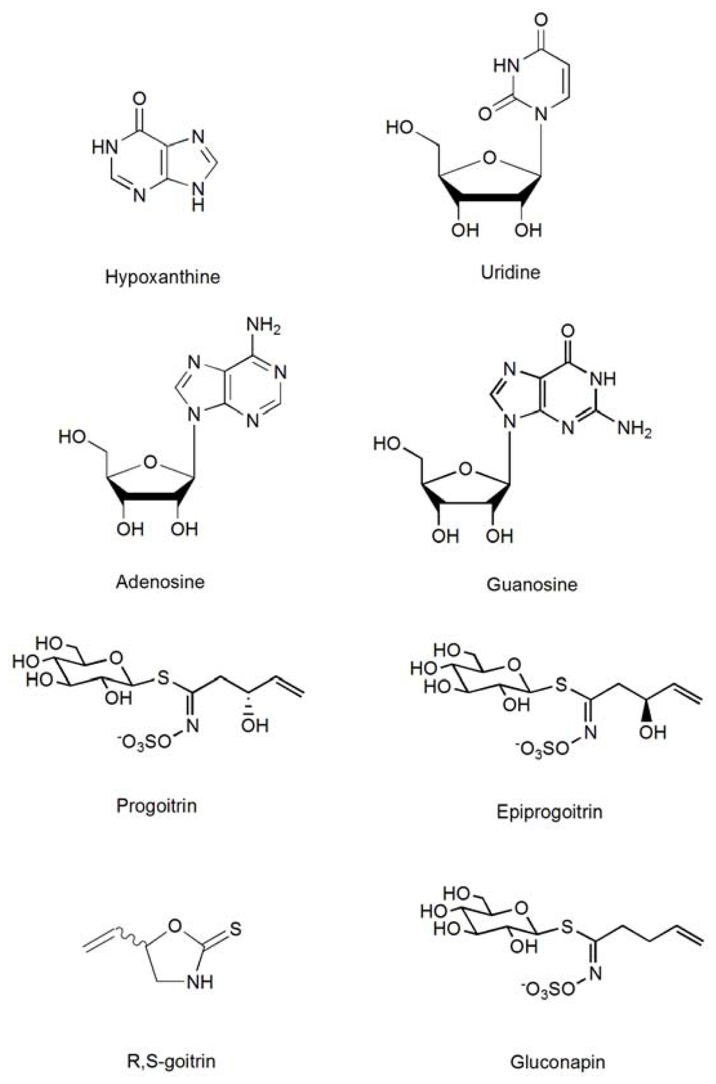 R,S-goitrin was obtained from Shanghai Research and Development Center for Standardization of Traditional Chinese Medicine (Shanghai, China). Hypoxanthine, uridine, guanosine, and adenosine were purchased from the National Institute for Food and Drug control (Beijing, China). Progoitrin, epiprogoitrin, and gluconapin were isolated from the root of Isatis indigotica Fort. and their structures were elucidated by mass spectrometry, 1H nuclear magnetic resonance spectrometry, and 13C nuclear magnetic resonance spectroscopy, and were confirmed by comparing the data with those of previous studies. The compound purity was over 98% based on the HPLC area normalization method. The standard structures are illustrated in Figure 6.