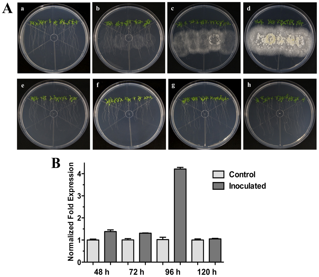 Direct Interaction. Time course development of direct interaction between Arabidopsis thaliana plantlets and Trichoderma atroviride in MS plates. (A) Photographs were taken for 25-day-old Arabidopsis (Col-0) plants inoculated with T. atroviride at different time points of interaction: 48 h (a), 72 h (b), 96 h (c) and 120 h (d) post-inoculation. Photographs of 25-day-old Arabidopsis (Col-0) control non-inoculated plantlets at different times are indicated: 48 h (e), 72 h (f), 96 h (g) and 120 h (h); (B) Expression analysis of HR4 gene in direct interaction. Quantification of HR4 gene by qRT-PCR, expressed as relative mRNA level compared with control conditions, was calculated after normalization to the Arabidopsis actin 8 gene using the comparative threshold method. Analyses were performed by triplicate. Control conditions or non-inoculated plantlets (light grey bars) and tester conditions or inoculated plantlets (dark bars) at 48, 72, 96 and 120 hpi, respectively.