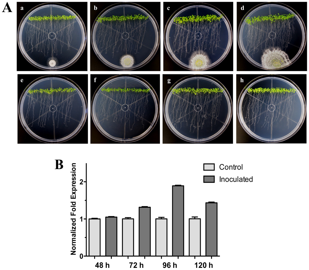 Distant interaction. (A) Development of distant interaction of Arabidopsis thaliana plantlets with Trichoderma atroviride. (a), (b), (c) and (d) photographs of 17-day-old Arabidopsis (Col-0) plantlets inoculated with T. atroviride, the plantlets were photographed at 48 h (a), 72 h (b), 96 h (c) and 120 h (d) post-inoculation. (e), (f), (g) and (h) photographs of 17-day-old Arabidopsis (Col-0) control non-inoculated plantlets of 48 h (e), 72 h (f), 96 h (g) and 120 h (h); (B) Induction of HR4 gene by T. atroviride at a distance. Quantification of HR4 gene by qRT-PCR, expressed as relative mRNA level compared with control conditions, was calculated after normalization to the Arabidopsis actin 8 gene using the comparative threshold method. Analyses were performed by triplicate. Control conditions or non-inoculated plantlets (light grey bars) and tester conditions or inoculated plantlets (dark bars) at 48, 72, 96 and 120 hpi, respectively.