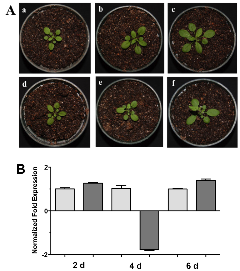 Soil interaction. (A) Photographs of Arabidopsis plants inoculated with Trichoderma in pots. (a), (b) and (c), 1 month-old Arabidopsis plants in pots inoculated with Trichoderma atroviride, the plants were photographed at (a) 2 days, (b) 4 days, and (c) 6 days post-inoculation. (d), (e) and (f), 1 month-old Arabidopsis control non-inoculated plants of (d) 2 days, (e) 4 days, and (f) 6 days; (B) Expression analysis of HR4 gene from Arabidopsis plants grown in soil pots. Quantification of HR4 gene from aerial part of plants by qRT-PCR, expressed as relative mRNA level compared with control conditions, was calculated after normalization to the Arabidopsis actin 8 gene using the comparative threshold method. Analyses were performed by triplicate. Control conditions or non-inoculated plants (light grey bars) and tester conditions or inoculated plants (dark bars) at 2, 4, and 6 dpi, respectively.