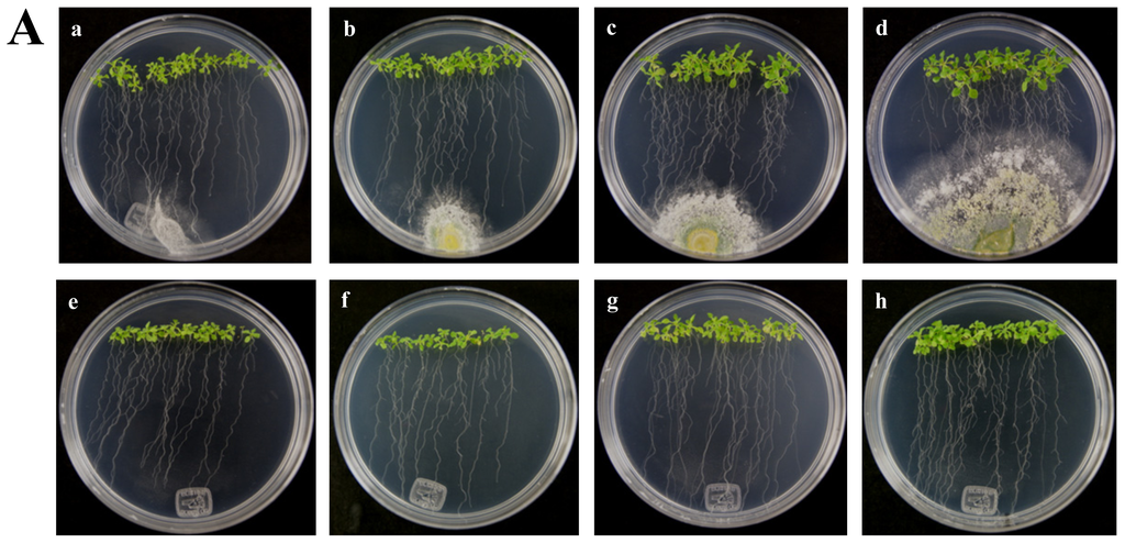 Arabidopsis thaliana (Col-0) seeds were surface-sterilized and sown on Petri dishes containing 0.5× Murashige and Skoog (MS) medium [1.4% (w/v) agar, 0.75% (w/v) sucrose] and placed at 4 °C for 2 days for vernalization, they then were placed in growth cabinets at 22 ± 1 °C for 7 days. Fifteen seedlings were transferred to Petri dishes containing 1× MS with 1.5% (w/v) sucrose, 1.4% (w/v) agar, the pH of the medium was adjusted to 7.0 and the seedlings were grown at 22 ± 1 °C for 16 days in a 16-h-light/8-h-dark cycle. After that period of time, Trichoderma atroviride was inoculated on the MS media as described below.