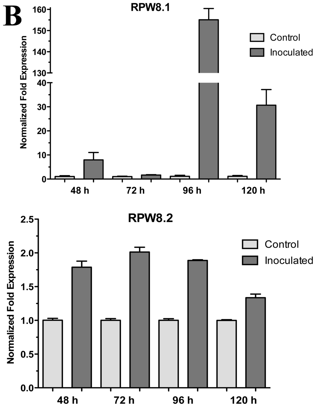 Expression of RPW8.1 and RPW8.2 genes from Arabidopsis thaliana ecotype Ms-0 in interaction with Trichoderma atroviride. (A) Development of interaction of Arabidopsis thaliana ecotype Ms-0 plantlets with Trichoderma atroviride. (a), (b), (c) and (d) photographs of 15-day-old Arabidopsis (Ms-0) plantlets inoculated with T. atroviride, the plantlets were photographed at (a) 48 h, (b) 72 h, (c) 96 h and (d) 120 h post-inoculation. (e), (f), (g) and (h), photographs of 15-day-old Arabidopsis (Ms-0) control non-inoculated plantlets of (e) 48 h, (f) 72 h, (g) 96 h and (h) 120 h; (B) Induction of RPW8.1 and RPW8.2 genes by T. atroviride interaction. Quantification of RPW8.1 and RPW8.2 genes by qRT-PCR, expressed as relative mRNA level compared with a control conditions, was calculated after normalization to the Arabidopsis actin 8 gene using the comparative threshold method. Analyses were performed by triplicate. Control conditions or non-inoculated plantlets (light grey bars) and tester conditions or inoculated plantlets (dark bars) at 48, 72, 96 and 120 hpi, respectively.
