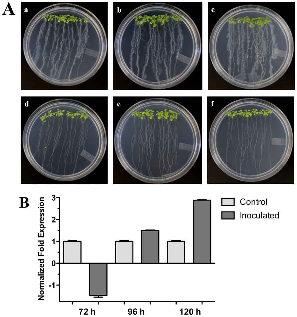 Pseudomonas fluorescens interaction. (A) Development of the interaction of Arabidopsis with P. fluorescens. (a), (b), and (c), photographs of 20-day-old Arabidopsis (Col-0) plantlets inoculated with P. fluorescens, the plantlets were photographed at (a) 72 h, (b) 96 h, and (c) 120 h post-inoculation. (d), (e) and (f), photographs of 20-day-old Arabidopsis (Col-0) control non-inoculated plantlets of (d) 72 h, (e) 96 h and (f) 120 h; (B) Expression analysis of the HR4 gene of Arabidopsis in interaction with beneficial bacterium P. fluorescens. Quantification of HR4 gene by qRT-PCR, expressed as relative mRNA level compared with a control condition, was calculated after normalization to the Arabidopsis actin 8. Control conditions or non-inoculated plantlets (light grey bars) and tester conditions or inoculated plantlets (dark bars) at 72, 96 and 120 hpi, respectively.