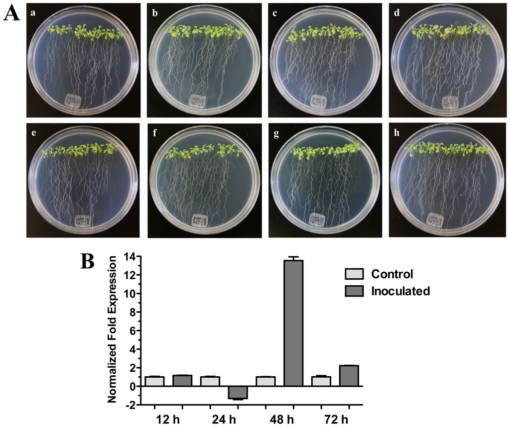 The effect of plant growth-promoting rhizobacterium (PGPR) Pseudomonas fluorescens on Arabidopsis (Col-0) 20-day-old seedlings was assessed (Figure 5A). We tested the expression of the Arabidopsis HR4 gene in interaction with P. fluorescens roots inoculated at 72, 96 and 120 hpi. As shown in Figure 5B, a gradual increase of the HR4 mRNA level with the progress of the interaction was observed, beginning with a repression at 72 h (−1.46), followed by inductions of 1.49 and 2.88-fold at the later stages of interaction.