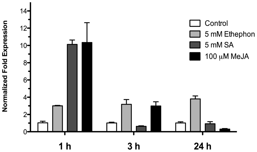 Phytohormonal treatment effects. Expression analysis of the HR4 gene from Arabidopsis by the addition of phytohormones, 5 mM ethephon, 5 mM SA, and 100 μM MeJA. Control conditions or without phytohormones (white bars) and tester conditions with 5 mM of ethephon (light grey bars), 5 mM SA (dark grey bars), and 100 μM MeJA (black bars) at 1, 3, and 24 h post sprayed, respectively.