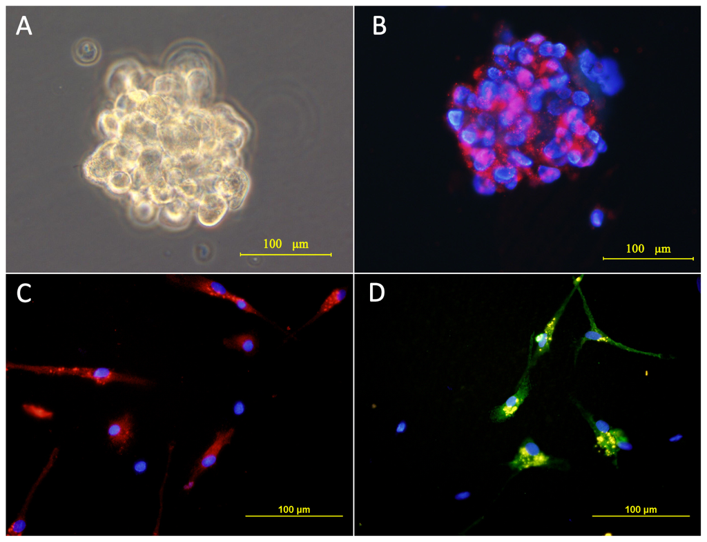A differentiation assay was carried out to assess the multipotency of the tumor spheres cells. The tumor spheres were harvested and cultured on coverslips precoated with poly-L-lysine (Sigma, St. Louis, MO, USA) in DMEM/F-12 containing 10% FBS in individual wells of a 24-well culture plate. The cells were fed with FBS-supplemented media every 2 days, and the coverslips were processed 7 days later using immunocytochemistry.