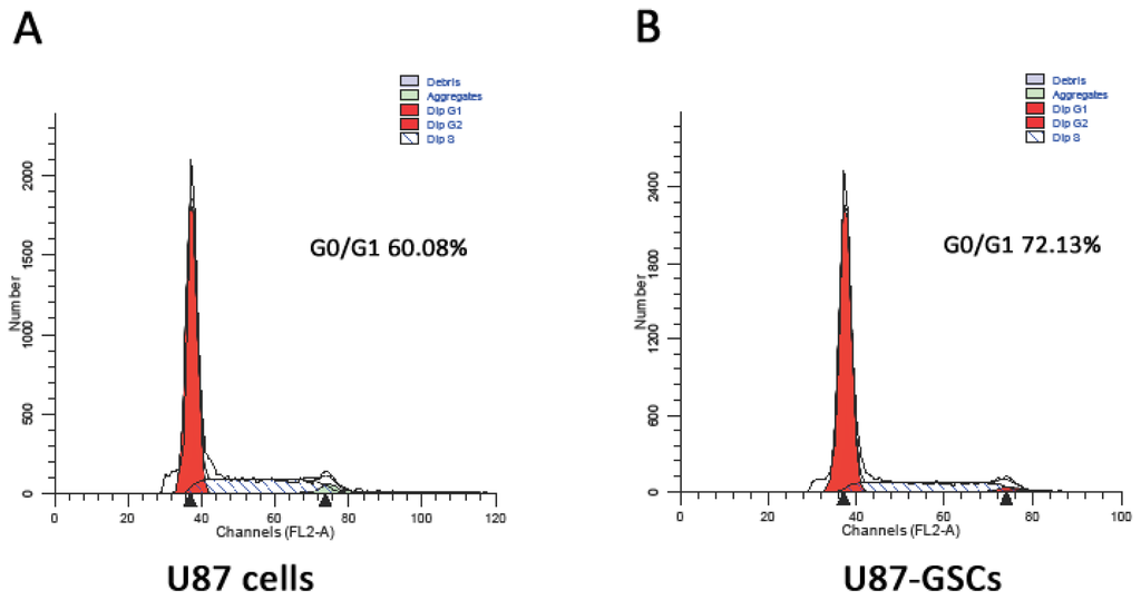 As depicted in Figure 2, cell cycle analysis demonstrated that the proportion of U87-SLCs in stationary phase was obviously higher than that of U87 cells (72.13% vs. 60.08%, p < 0.05). The results indicate that most U87-SLCs are quiescent, which is concordant with the findings of other studies [3,17,34,35].